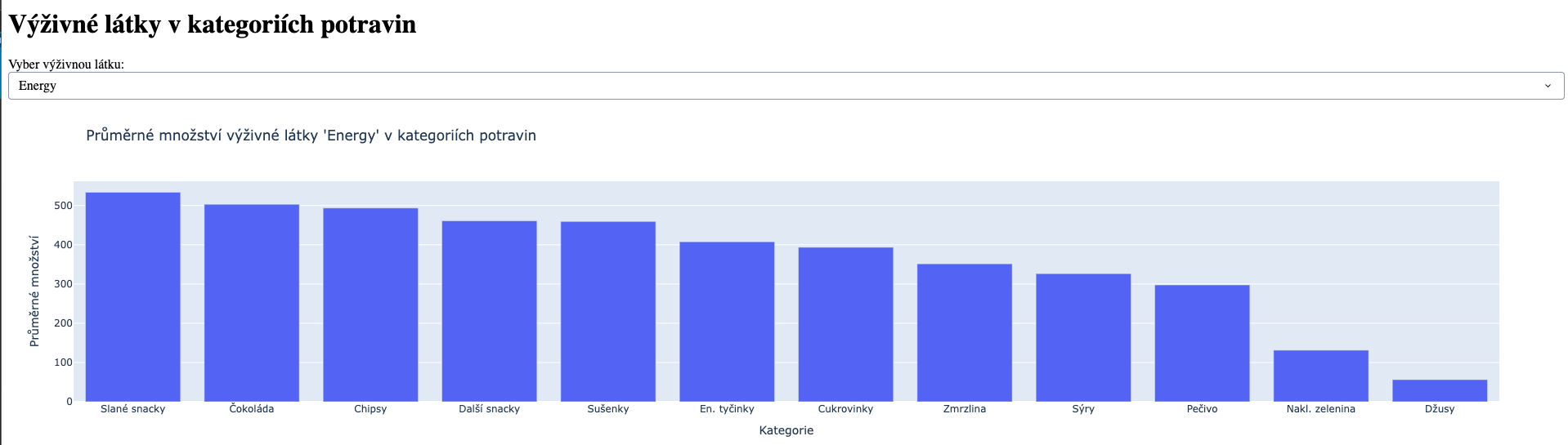 Funkce update_chart přijme jako parametr aktuálně vybranou výživnou látku (selected_nutrient). Uvnitř funkce připravíme data a vytvoříme graf pomocí px.bar. Ten funguje podobně jako sns.barplot, který už známe. Funkce musí na konci graf vrátit pomocí return fig.
